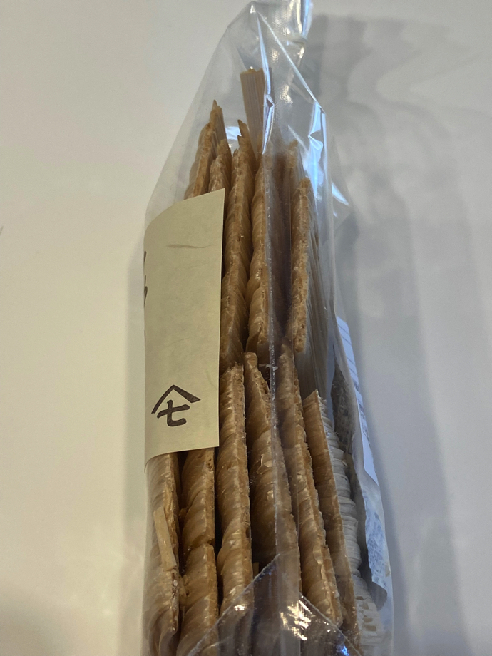 横から見てみるとよくわかるが、凧糸を巻いたようなものに似ている。取り出して食べてみると、薄い飴を伸ばして巻いたもので、幅1cm程度でパリッとわれる。口に入れるとパリパリと砕け、ミルフィーユ状というか薄い層が何重にも重なっているのがわかる。確かにせんべいと言われれば、なるほどと思う程度に薄いあめだった。