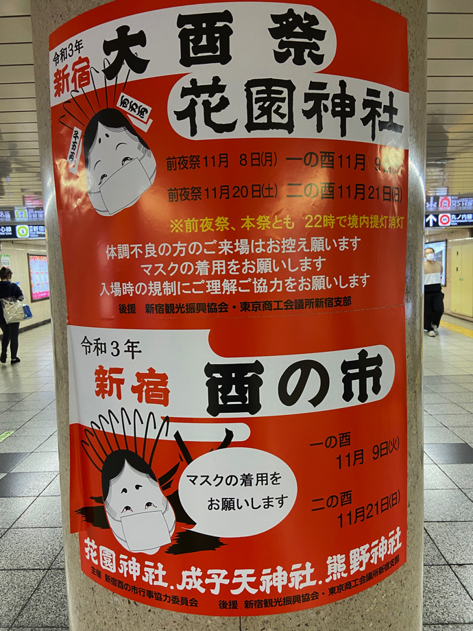 酉の市を思い出したのは、新宿駅から新宿三丁目方向に伸びる地下通路を歩いていたときにポスター見つけたからだ。これを見なければ思い出すこともなかっただろう。コロナ前は毎日のように歩いていた新宿だが、最近では月に一度か二度程度くるのがせいぜいになってしまった。