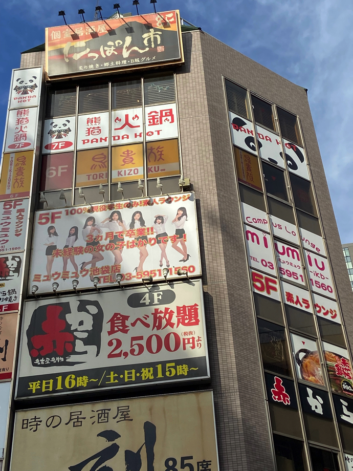 これがビルの壁面看板になるともっとドキドキする。4Fの看板はよく知っている外食チェーンだ。5Fはどうやらお姉さんがいるお店らしい。6Fは有名な焼き鳥チェーン店。ここまでは日本語だけで理解できる。そして7Fは「熊猫火鍋」と書かれている。確かにパンダのことを熊猫と表記することは聞いてはいるが、日本語のセンスではないような気がする。それでも、まだ日本的な漢字常識で認識できる。ところが、池袋では一見して漢字だとわかるが、ちゃんと見ると読めない漢字というのが町中に溢れている。熊猫世界をこえている。