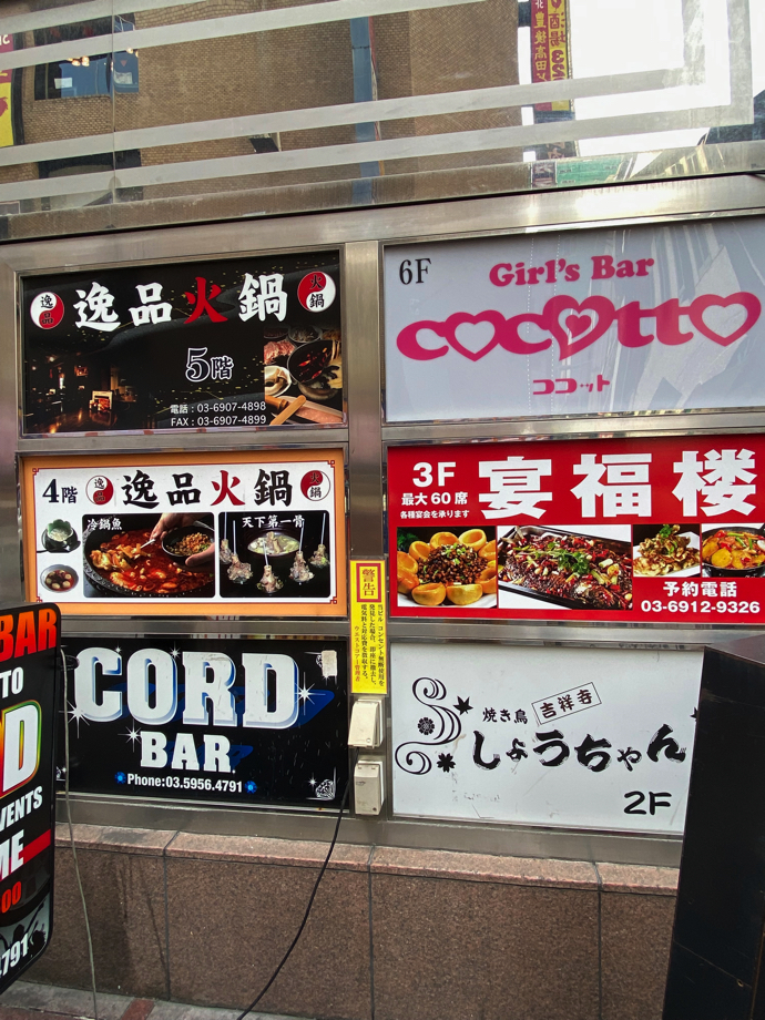 このビル一階の看板も普通に見ればなんの違和感もない。よくあるビルの店舗案内だ。ただ、4階 逸品火鍋をよく見れば、さりげなく読めない漢字が使われている。これがハングルだったりアラビア文字、タイ文字など全く読めない文字であればまた感じ方も違うのかもしれない。