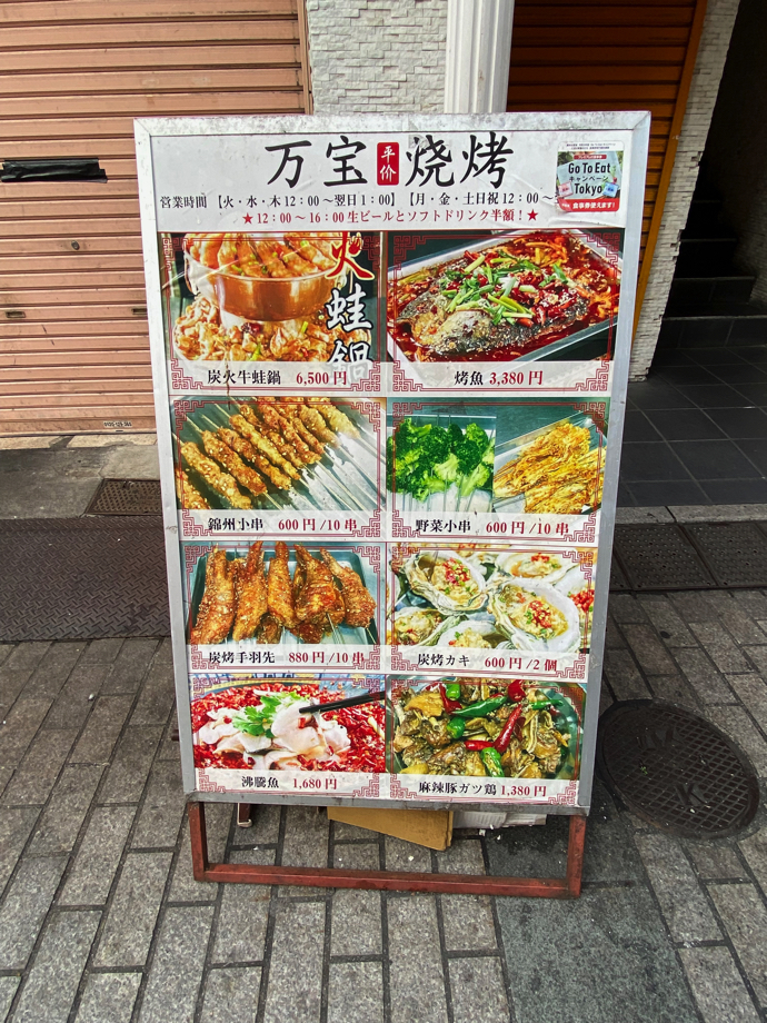 例えばこの看板だ。上部の万宝は読める。多分、意味もわかる。しかし下の「火ヘン」の二文字が読めないし、わからない。おそらく火をつかってある字だから、何らかの焼き物みたいなものではないかと想像する。看板の裏側を見ると、どうも串焼きのようなものらしい。読める漢字と読めない漢字が混在するのが、モヤモヤする原因だ。