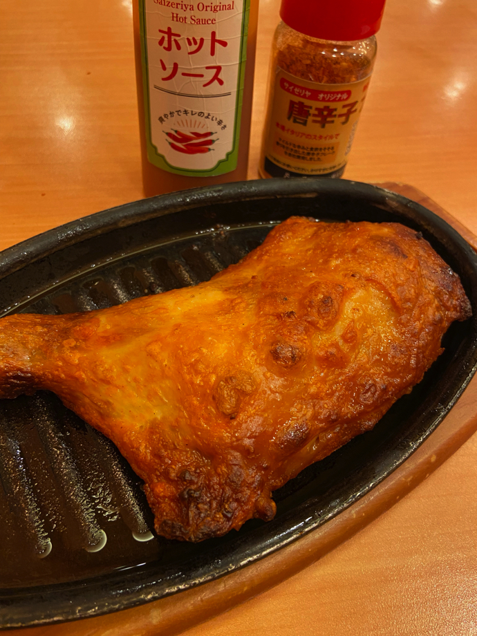 そして最近登場した、辛い鳥もも肉のグリル。これもイタリアンかと言われれば、頭の中はクエッションマークで埋め尽くされるが、明らかに肉料理としてうまい。骨つき肉は骨の周りの軟骨部分が楽しみだが、四国丸亀名物の骨付き鳥に通じる「肉食いました」感がある。根本の骨部分を手掴みで食べれば、例の漫画に出てくる原始人の肉っぽいところもある。鳥もも肉は、ナイフとフォークではなく手掴みでガブっと行きたいものだ。まさにそれは、人類のDNAに刻まれたうまい肉の記憶だ。