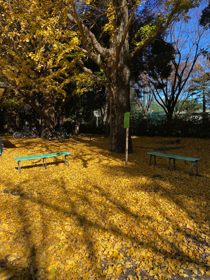 イチョウは落葉がすごいので、この時期は木の下も真っ黄色になる。黄色くなった地面、これも楽しみな光景だ。初冬の日差しはお昼でも斜めから差し込む。それで、地面に写る影も合わせて、なかなか綺麗な光景になる。
