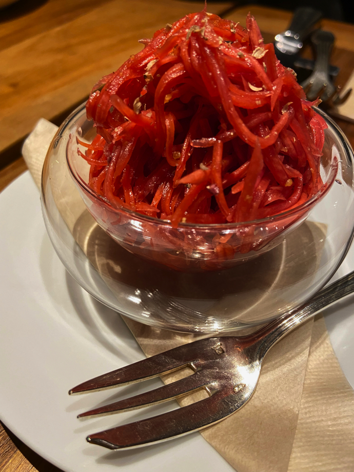 この赤い野菜はニンジンのラペ、酢で締めたニンジンとてもいえば良いのだろうか。赤いのはおそらくビーツを使ったのではないかと思うったが、料理を運んでくれた従業員に聞きそびれてしまった。