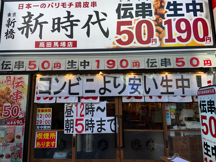 もう一軒すごい看板を見つけた。コンビニより安い生中!と書いてある。色々と突っ込みたい表現だ。ただ、そこは素直に宣伝文句を信じてあげようか。おそらく、生ビールではない生中を頼み、一本50円の伝串(これもどんな食べ物なのか)を頼み、250円払って出てこよう。とてもお安い高田馬場のダンジョン探検だ。