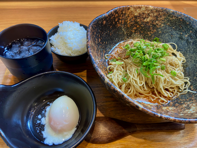 いささかためらいながら、いざ食べることに決めて注文しようとしたら、なんと選択肢はほとんどない。基本は辛さを選ぶ、麺の量を選ぶだけ。お店の方から、おすすめのランチセット、温玉と小ライス付きを勧められ、なんとなくそれにしてしまった。席について2分ほどで注文した品物が出来上がった。早いのはありがたい。その二分間待っているうちに満席どころか外に行列ができていた。人気店なのだ。