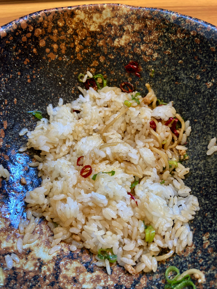 正直にいうと、この混ぜ飯が抜群にうまい。麺よりもこちらが気に入ってしまった。できれば、TKGに続く第二の混ぜ飯コンセプトとして独立して欲しいくらいだ。小さい茶碗に入った白飯、味付き飯などが5種類くらいあり、トッピングで鶏そぼろ、オカカに鰹フレーク、海苔に錦糸卵が良さそうだ。後は薬味に、ネギ、山椒、生姜等々がついていて、タレが甘い醤油、出汁醤油、味噌タレ、にんにくタレみたいなラインナップにする。大きめのどんぶりでかき混ぜては食べていくと、段々に色々な味が混合されていって・・・。と、業界初のまぜまぜご飯屋のコンセプト開発をしてしまった。