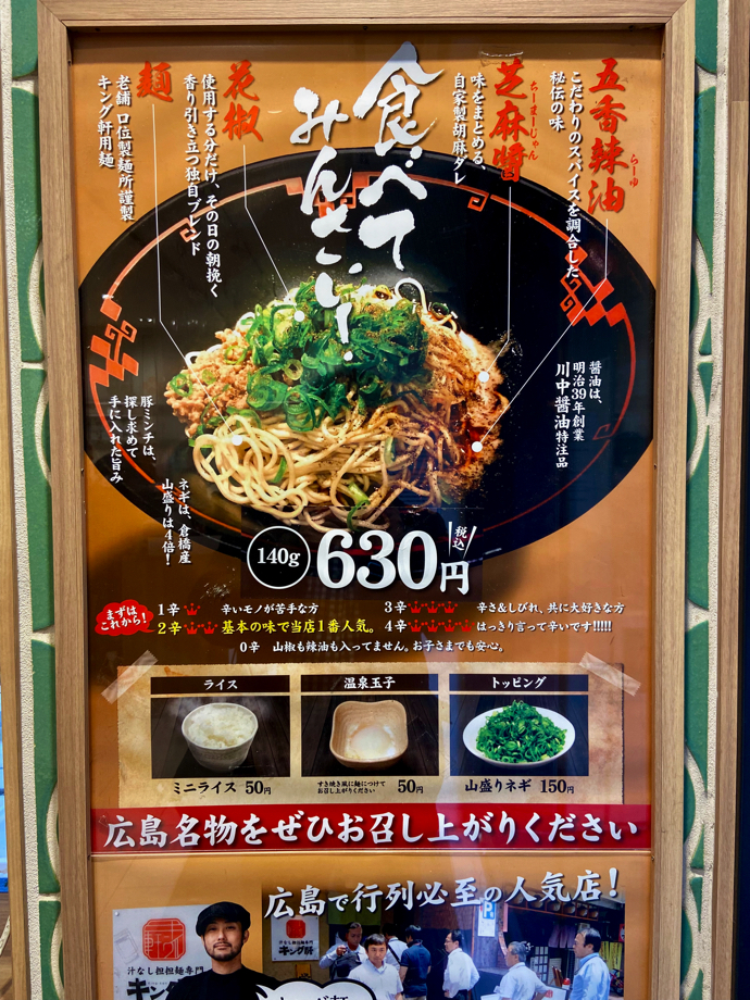 ただ、広島名物汁なし坦々麺に限らず、油そば、汁なしそばの類をちょっと苦手としている。個人的な偏見だが、あまり旨いと思ったことがない。たぶん、濃い目の辛いタレと麺のバランスが好みではないのだろうと自己分析している。もっと、汁だくにしてくれればなあと、油そばを食べながら、いつも思っている。