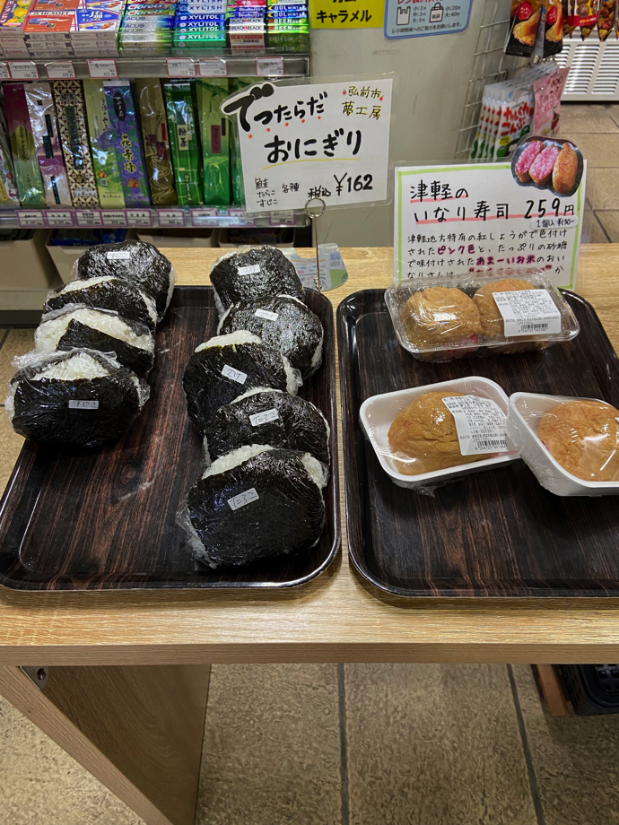 帰り際に立ち寄った改札脇のキオスク(いまはNew Daysか)でも何やら魅力的なビッグおにぎりとビッグ稲荷寿司が売っていた。ゲンコツより大きいおにぎりは、とても魅力的だった。腹ペコ状態でこれをむしゃむしゃ食うことを想像すると、思わずごくんと唾を飲み込んでしまう。弘前駅は美味しいものの宝庫だった。