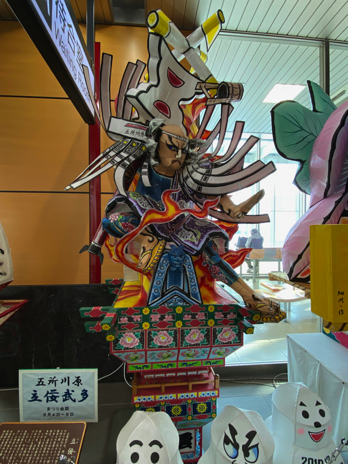 新青森駅でホームから降りたすぐの場所に、青森三大?ねぶたが飾られている。ねぶた祭りといえば青森市で行われて大きな山車が街の中を引き回されるものと思っていたが、五所川原、弘前でもそれぞれ独自のねぶた祭りがあるようだ。