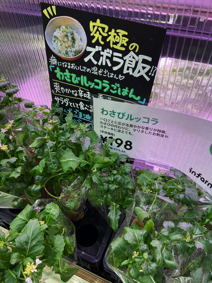 ルッコラとパクチーとバジルが売っている。コレは相当料理を選ぶ野菜、香草だが売っているところが少ない希少野菜だと思う。東京世田谷では当たり前に売られていても不思議はないが、埼玉県某市であればなかなか珍しい。この見学の後地元のスーパーに行ってチェックした。バジル、ルッコラ、パクチーとも置いてある店は一店だけだった。香草は文化の象徴なのか。少なくとも「わさびルッコラご飯」という発想が出てくる時点で、文化の次元が異なるような気がする。首都圏内でもこの差なのだから、全国で比べるとどうなることか。