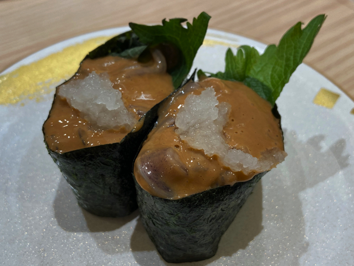 そして、締め中の締めは、なんと「塩辛巻」。これも普通の回転寿司ではなかなか見かけない、チープだがリッチだかよくわからない軍艦巻きだ。ただ、結論を言えば塩辛巻は締めで食べるより、飲んでいる途中の箸休め的に食べる方が良さそうだ。塩味と米のバランス、特にシャリ玉が小ぶりなので、つまみとしての適性が「米の酒と米の肴」という点で、抜群に良いと思う。