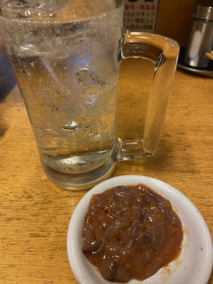 入り口に書かれているメニューに嘘はない。実に大衆居酒屋っぽいメニューだ。個人的にはチーズサラミという昭和中期の人気メニューが健在なのが嬉しい。キャベツコンビーフ炒めというのも、これまた郷愁をそそるというか、実に東京の大衆居酒屋らしいメニューだと思う。我がホームタウンである北海道の都市部では、こんなメニューは見たことがない。そういえば、エイヒレも東京に来て初めて食べた「びっくり食べ物」だった。東京で当たり前の食べ物が、地方都市に行くと存在しないことは多い。