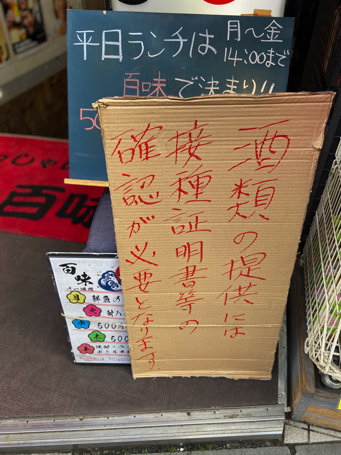 どうも掲示物制作が間に合わなかったらしく、なじみの居酒屋では情感溢れる段ボール紙に手書きの注意書きがあった。思わず涙が込み上げるほどの「切なさ」が溢れていたので、とりあえずお店に入ってみた。当たり前だが、ちゃんと接種種証明(スマホ)を確認された後でようやく入店できた。店内はガラガラだった。おそらく「スマホ不得手」の高齢者は、この接種証明をスマホで提示というだけで店に入る気力を無くすだろうなあ。