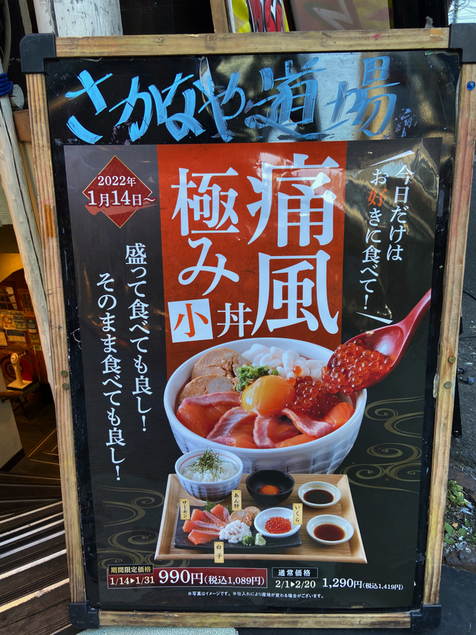 まさに「痛い」看板だった。気持ちはわかる。うまいものを、制限なしで、今日だけ限定で、自分を甘やかしていいのだよ、と悪魔の囁き。痛風に悩んでいない人には、クスッと笑える表現だろうが。