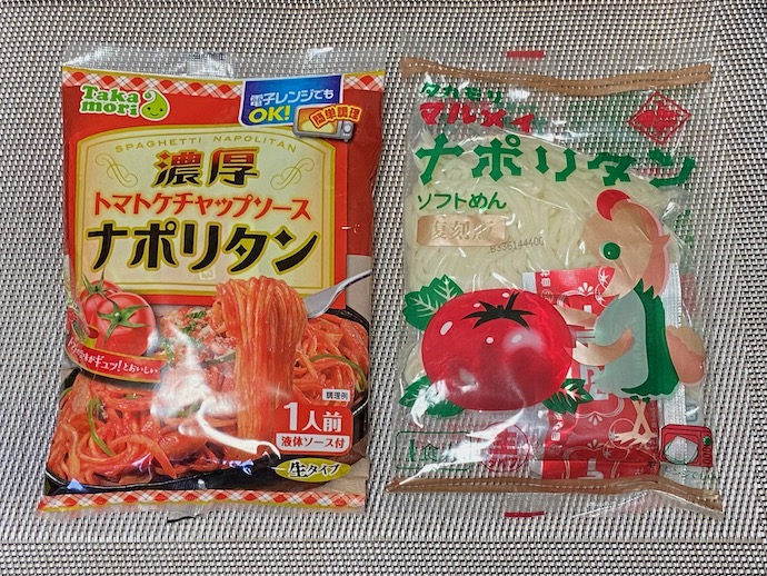 右側の方が売れ筋人気ランキングに載っていたものだが、左側のビジュアルが良さそうだったので、両方買ってみた。熊本でナポリタンが人気あるとは知らなかった。