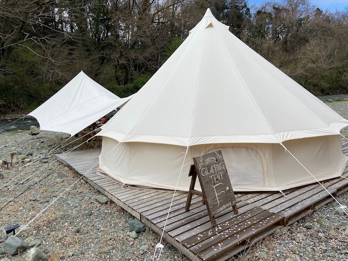 そしてこのキャンプ場は川沿いにある「グランピング」施設が主体のようだ。離れたところにテントサイトもあるのだが、この超高級グランピング・テントを見てしまうと、心が半分くらい持っていかれてしまうだろう。何も知らずにテントをサイトを予約してきたら、楽しいキャンプ気分をぶち壊してくれる「凶器的存在」だ。でも、ここで泊まってみたいというワクワク感が湧き上がる。困ったやつだ。