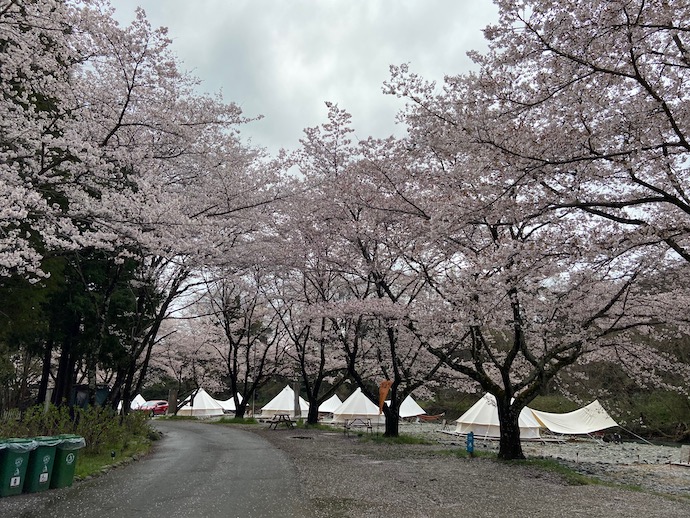 また、この季節ならではの光景だが、桜並木沿いにグランピング施設が並んでいる。いわゆる「映え」のする光景だ。春休み中ということもあるのか平日にも関わらず利用者が多い。朝のキャンプ場といえば子供の声で騒がしいというのが相場だが(まあ、それを楽しむのもキャンプらしさではあると思う)、ここは意外と静かだった。大人のグランピング場ということと、朝食はセンターハウスで楽しめるらしい。