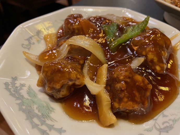 この店で注文するのは決まって酢豚だ。マイ定番と言って良い。この酢豚も気を衒ったところは全くない。生姜味の豚肉唐揚げに玉ねぎとピーマンで仕上がっている。きくらげやパイナップルやきゅうりといった変化球は一切入っていない。最近食べたマンゴー入り酢豚(中国人シェフの店)などという令和進化系とは全く異なる。