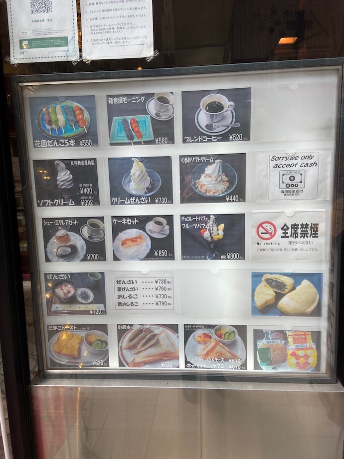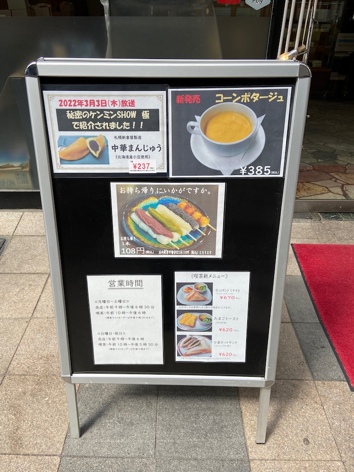 あまり目立たないが2階に喫茶コーナーがある。札幌では珍しい甘味喫茶なので、昼下がりの暇そうな時間を狙って、クリーム餡蜜や団子セットなどが食べられる。団子とコーヒーのセットというのは、なかなか他では食べられない魅惑のセットではないか。みたらし団子とブラックコーヒーという組み合わせには、ちょっと震えがくる。ちなみにこの店では、謎の北海道菓子「中華まんじゅう」も売っている。隠れ札幌土産として推奨したい。