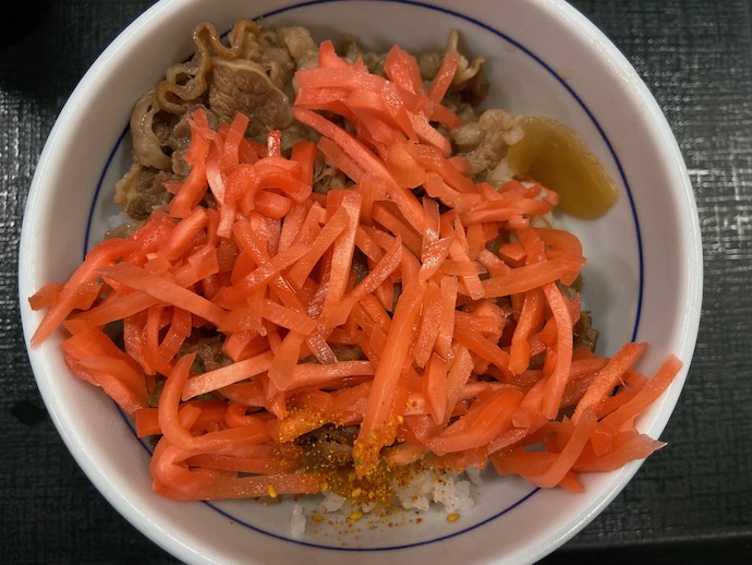 そんな初期牛丼体験から、いつの間にか週3牛丼フリークになったのは、紅生姜による味変が可能だったからだと思っている。