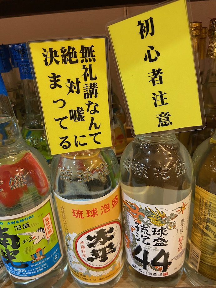 「初心者注意」というのも親切そうで、これまたずいぶんな言い分に聞こえる。それでも与那国島の泡盛と比べれば、まだずいぶん度数が低い。マイルド級だ。与那国の泡盛は、アルコール度数がとてつもなく高いので火がつく。危険物なので飛行機の機内持ち込みに制限がある。