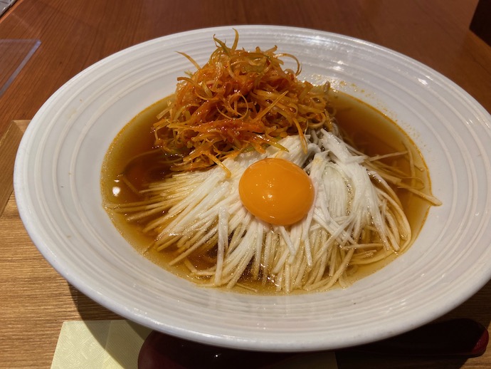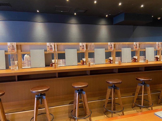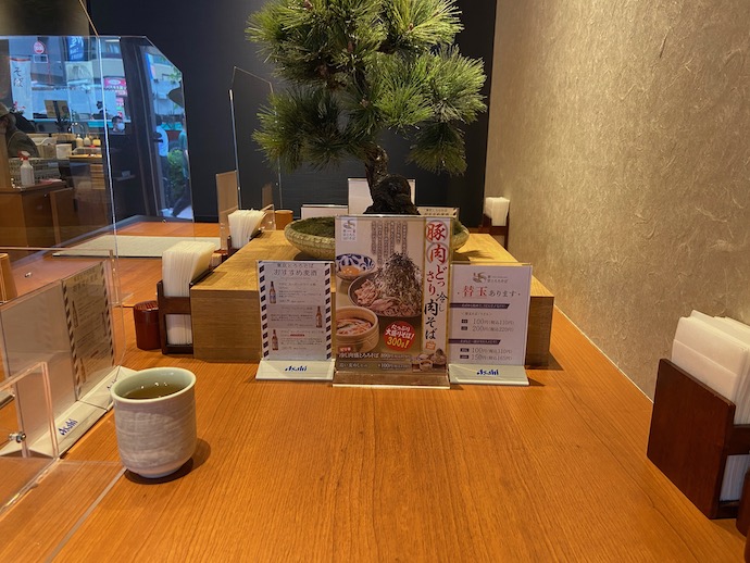 店内は、流石にコロナ感染期に開店した店舗ということもあり、通路を含めた広い空間がとられている。駅前の立地にありがちな、席をぎゅうぎゅうに詰めた感じは全くない。盆栽らしき鉢植えがなんともオシャレ感がある。上野あたりの蕎麦屋で見た記憶があるが、盆栽は蕎麦屋には似合う装飾だと思った。これがレンタルの観葉植物だといささか残念感が出るのかもしれない。