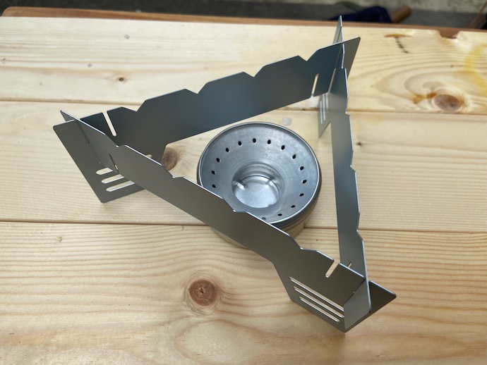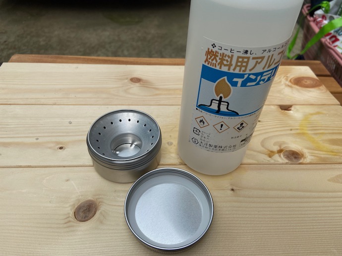 お試し道具は二つあり、一つがアルコールストープ。100均で手に入れたもので、お値段は330円。中央部の穴の中にアルコールを注ぎ込み火をつける。極めて簡易というか、火をつけたら消えるまで放置という仕組みなので、火力調節はできない。