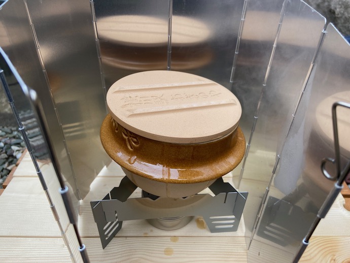 この土鍋(土釜?)で釜飯は何度も作ったことがある。昔々、オートキャンプで遊んでいた時期には、車の中に積みっ放しにしていたくらいだ。ただ当時はガスコンロを使っていたのが、今回はソロキャン用のお道具を使ってのお試しだった。