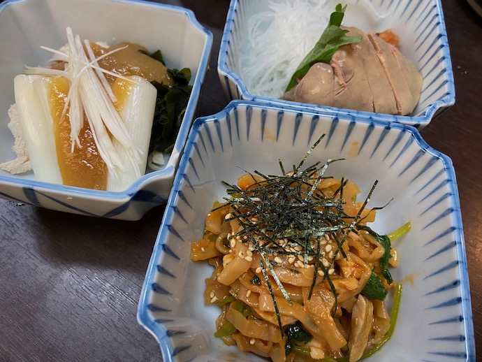 小鉢料理もラインナップが素晴らしいと思っている。昔は鳥ささみのたたきなど生食料理もあったが、最近は食品衛生上の問題で生の鳥はなくなった。その頃の名残が、湯がいた鳥ささみをウニソースで和えたもの。生の鳥が出されていた頃は、人生が変わるくらいうまいものだと思っていたが、今のやり方でもなかなかの逸品だ。