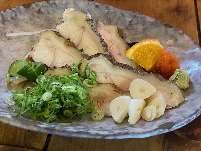 親どり足というのは、高松名物の骨付鳥のアレンジだ。流石に鰹のタタキが一番上にのせられているのは高知人のカツオ好きのためか、旅行者にも名高い「葉牡丹」の県外客向けアピールか。そちらにしても、カツオが別格メニューであることは確かだ。
