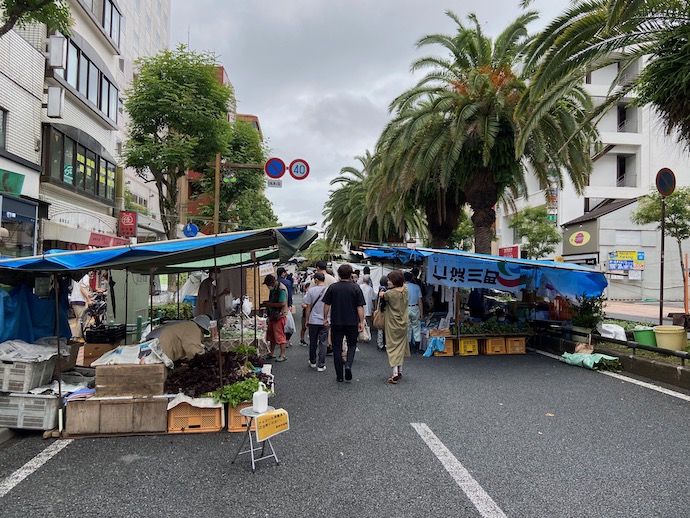 コロナが流行る前は、道の両側に隙間なく屋台というかテントがびっしりと並んでいた。今回確かめてみると1/3くらいが空き家になっている。たまたまこの日は休んでいたのか、あるいはお店の免許を持った方達が廃業してしまったのか、定かではない。あてにしていた高知特有の野菜売りのおばちゃんの店、自家製の布袋など小間物を売っていたおばあちゃんの店も無くなっていた。