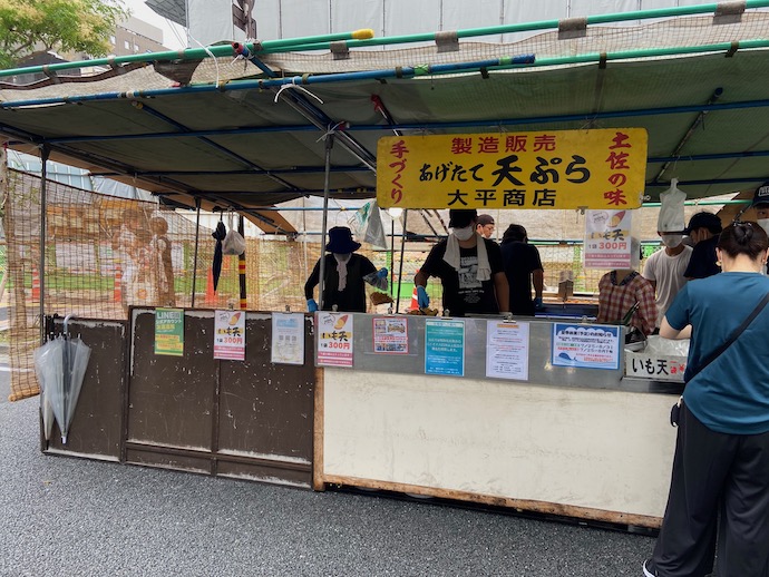 日曜市では、多分一番行列ができる店の「いも天」。これは一度食べてみなければ旨さがわからない、高知の隠れ名物だと思う。さつまいもをざっくりと乱切りにして、それに衣をつけて揚げただけだ。衣は甘めだ。例えていえばホットケーキミックスみたいなもので、普通の天ぷらとは違う。揚げたてを売っているので、紙袋に入った「天ぷら」は手で持つのも難しいほどの熱々だ。これをハフハフ言いながら食べる。手が油でベタベタになるが、そんなことを気にしてはいけない。