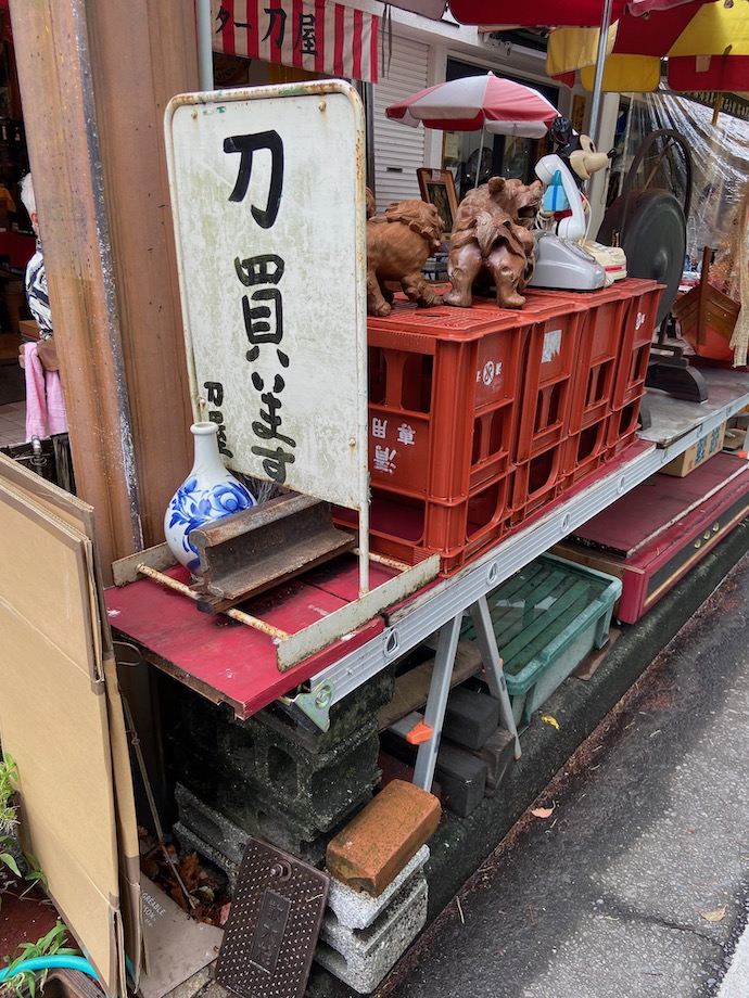 その日曜市の端っこの方は、刃物や古道具店の店頭で露店商売が楽しめる。店の前に置かれた怪しげな物品はまさに掘り出し物とガラクタの混在で、ひとつひとつじっくりと眺めたくなる。そして、ここでしか見られない光景もたくさんある。