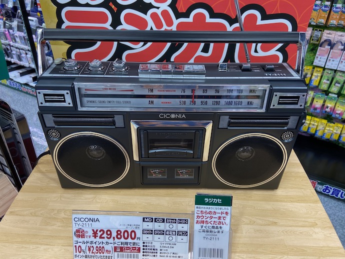 そのオーディオコーナーにまさかのラジカセが新発売されていた。音源はカセットデッキとラジオだけでCDは不可だ。なんだか50年前くらいに売っていたものと同じに見える。FMのバンドは広いので、最近のAMラジオがワイドFM化したものは聴ける。