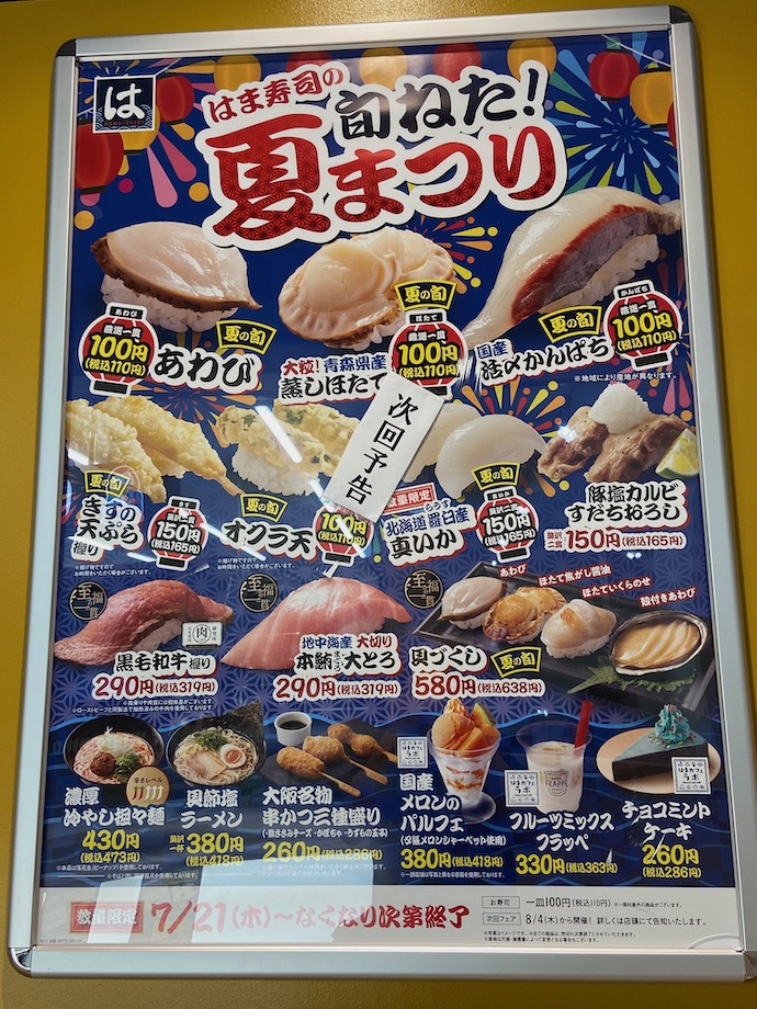 この夏一番の外食企業ダメダメ事件といえば、スシローのおとり販売事件で、明らかに法的にアウトと認定された後も、続々と事件が続く異常体質があからさまになった。それをアザワラウかのように見える競合チェーンの広告を見つけてしまった。このポスターは翌日から始まる夏まつりの事前告知だ。何もこの時期にお騒がせしなくてもと最初は思ったが、よくよく見ていると面白みが込み上げてくる。次回予告と真ん中に一枚貼るだけで、かなり強烈な競合批判になっている。