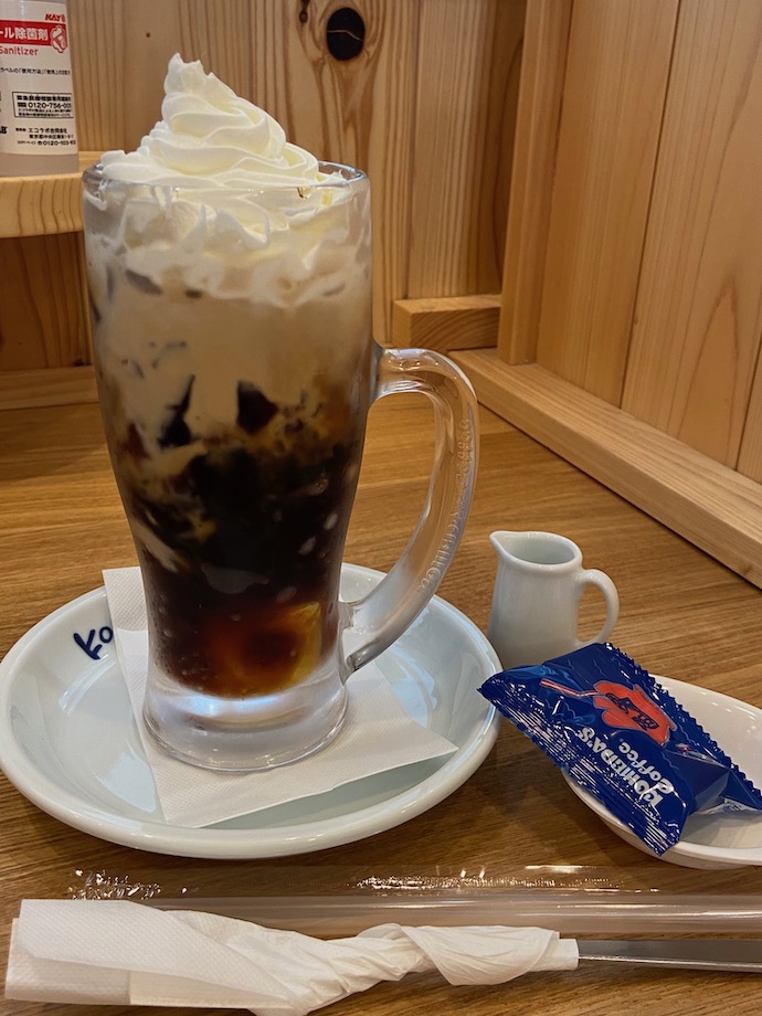 コーヒーゼリーは入ったアイスコーヒーにクリームがたっぷり乗ったものを頼んだ。昔で言えばコーヒーフロートの変形盤だろう。今ではすっかり〇〇ラテや〇〇フラペチーノに置き換わってしまった、昭和の遺物みたいな飲み物だ。ただ、現代的アレンジもあり、中身のアイスコーヒーが加糖か無糖を選択できる。無糖を選択するとシロップ添加するかも聞かれる。ご自分で甘さ調整をどうぞ、ということなのだろうが、クリーム山盛りで無糖というのは、なかなか奇妙な注文という気がしたので、あえて、無糖、シロップ付きで頼んでみた。