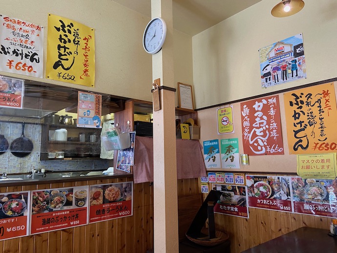 とれたて、焼きたての鰹を食べたければ、市場の中にある食堂で楽しむこともできる。焼き魚も含め地場の魚を中心に素朴に美味しいものが用意されている。カツオ丼(ドンではなくドンブリと読む)は、飯とカツオというシンプルな組み合わせが最高で、カツオ好きにはたまらない。