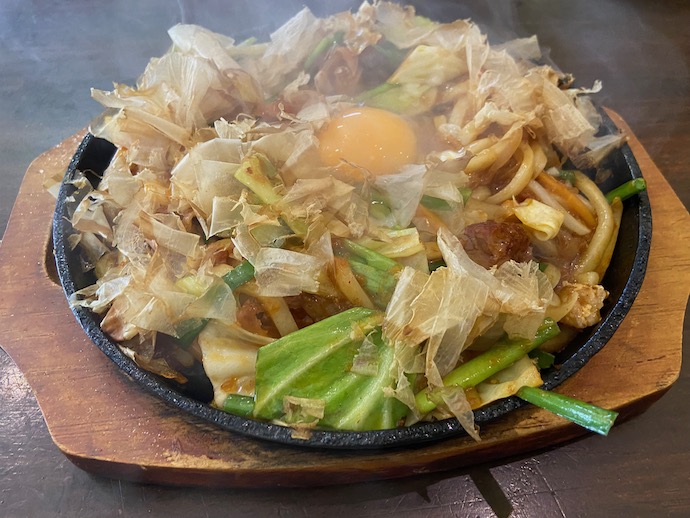 熱々の鉄板に乗せられた焼きうどん(焼きラーうどん)は、卵と鰹節が乗っている。個人的にはこれをごちゃごちゃと混ぜ合わせて、食べるのが好みだ。味付けは漁師のラー油が効いているので、それなりの辛味はあるが塩辛くはない。卵の黄身のせいで甘さすら感じる。熱いうどんをハフハフいいながら食べると、今日も一つ美味しいものを食べました、ありがとうございます、という気分になる。