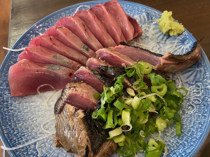 などと、焼きラーうどん食べながら酒漬けの妄想していたら、知人の魚屋さんが差し入れてくれたカツオの刺身とたたき。そうそう、これを食べにはるばるクレまで来たのだよと、改めて感動するのでありました。