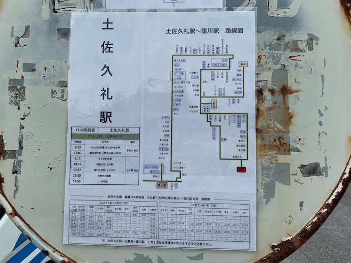 最近見たテレビの旅番組で、路線バスを乗り継いて四国をぐるっと回る難関旅が放送されていた。その中にここの駅が登場した。愛媛から山の中をくぐり抜け、高知を目指す行程だった。ここの駅前でコミュニティーバスにのりつぎ隣町に行く。そこから高知駅まで路線バスで移動ということだったが、そもそもこの駅にバスが来ていることすらよく覚えていなかった。