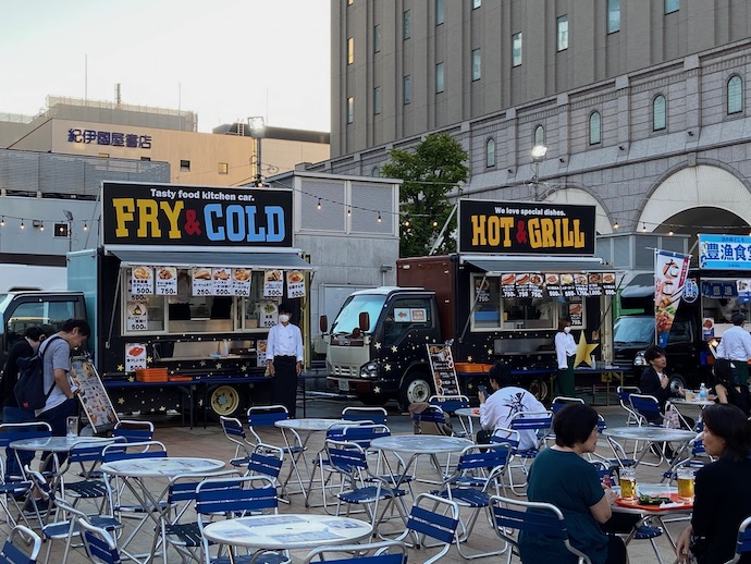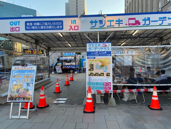 首都圏であれば、こうした高層ビルの屋上にビヤガーデンが開かれることが多い。高いところであれば少しは涼しいはずだということなのだと思うが、生ぬるい湿った風しか吹かないので、体感温度的に地表と変わらない。