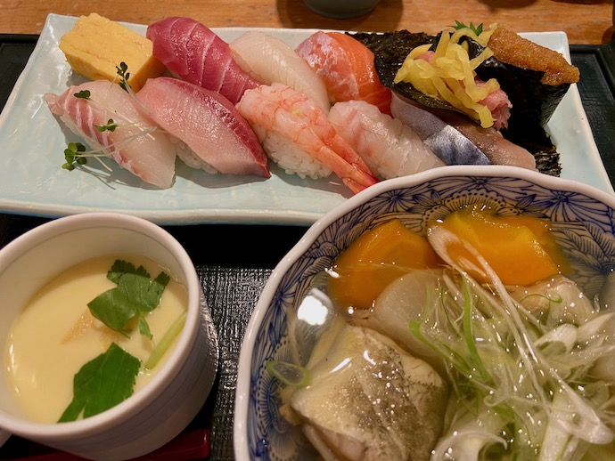 ランチの定番は、微妙に値上がりしていた。茶碗蒸しは相変わらずレベルが高い。日替わりというか時間替わりの汁物も満足度が高い。全体としてお買い得なランチであることには間違いないが、値上げと同時にシャリ玉も大きくなった気がする。