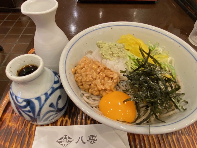 しばらく食べていなかった納豆蕎麦を注文した。納豆とたくあんの千切りが乗った蕎麦は、お江戸ではあまり見かけない。ただ、これをビピンパのようにグチャグチャに混ぜて食べる気にはならない。納豆と蕎麦をつまみながら食べる。海苔と蕎麦をつまみ食べる。そんな感じでトッピングを別々に楽しむのが自分の流儀だ。