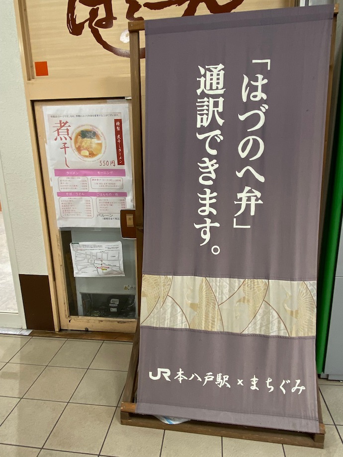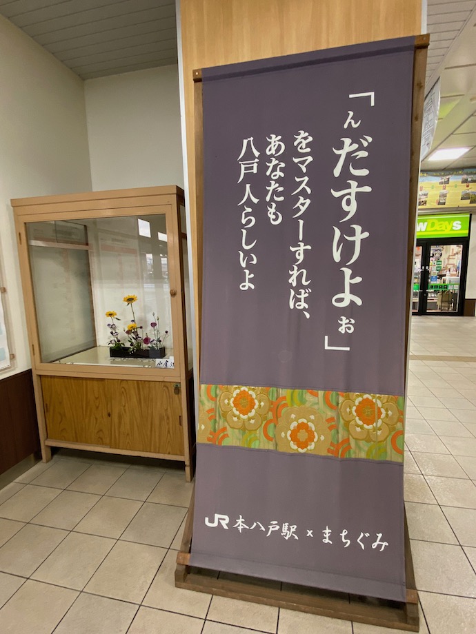 駅の改札近くにこれまた「南部」的な飾りが展示中だったが、在来線と新幹線が同居しているせいか、どうも駅の中に統一感がない。というかバラバラな感じがする。それともJR対青い森鉄道の、密かな対抗心でもあるのだろうか。