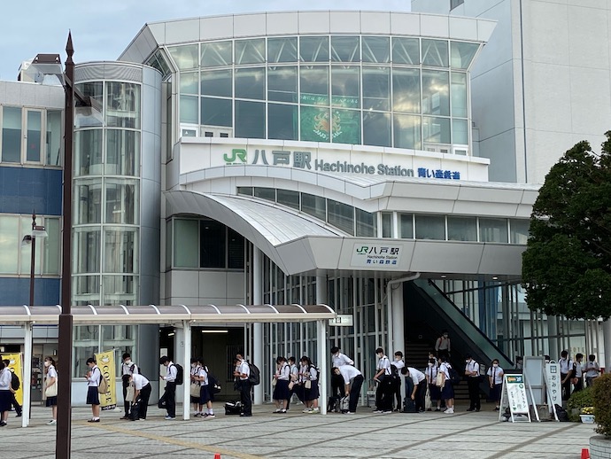 八戸駅でJRから青い森鉄度に乗り換える。朝の時間帯は高校生のバス待ち行列が伸びていた。微妙に行列の間隔が空いているので、これがコロナ後遺症の一つだろうなと思う。