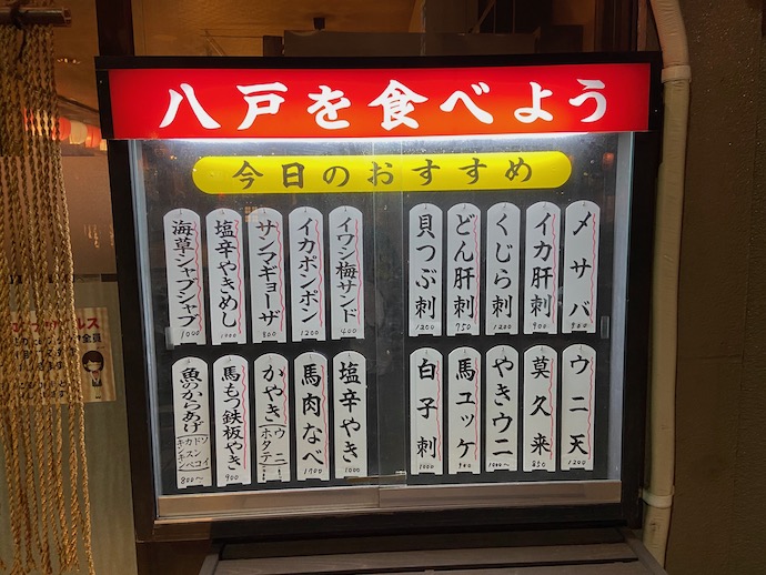 地元料理の店先で便利なものを発見した。八戸名物の一覧表になっている。この中から何を食べようかとあれこれ考えていた。一番気になったのは「どん肝刺」で、メニューの並び具合からすると魚介類らしい。「どん」という魚が八戸にいるのだろうか。