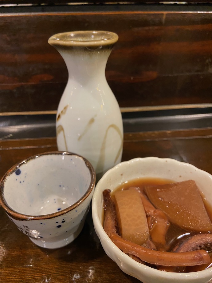 こちらのお店では、お燗がちょっと熱めだったが、お通しはイカとさつま揚げの煮物。ああ、コレは美味いぞ。思わずおかわりを頼みそうになった。イカの味がよく出た濃いめの味付けは、熱燗の肴にぴったりだ。どこからか演歌が聞こえてきそうな組み合わせだ