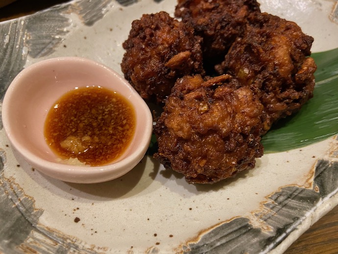 こちらのイガメンチ(イカではなく、イガ)は小ぶりの一口サイズだった。味付けはいつも食べているものよりも濃い味で、酒の肴向きということらしい。生姜醤油で食べよと言われ素直に試してみたら、まさに大正解だった。イガメンチ、うまし。