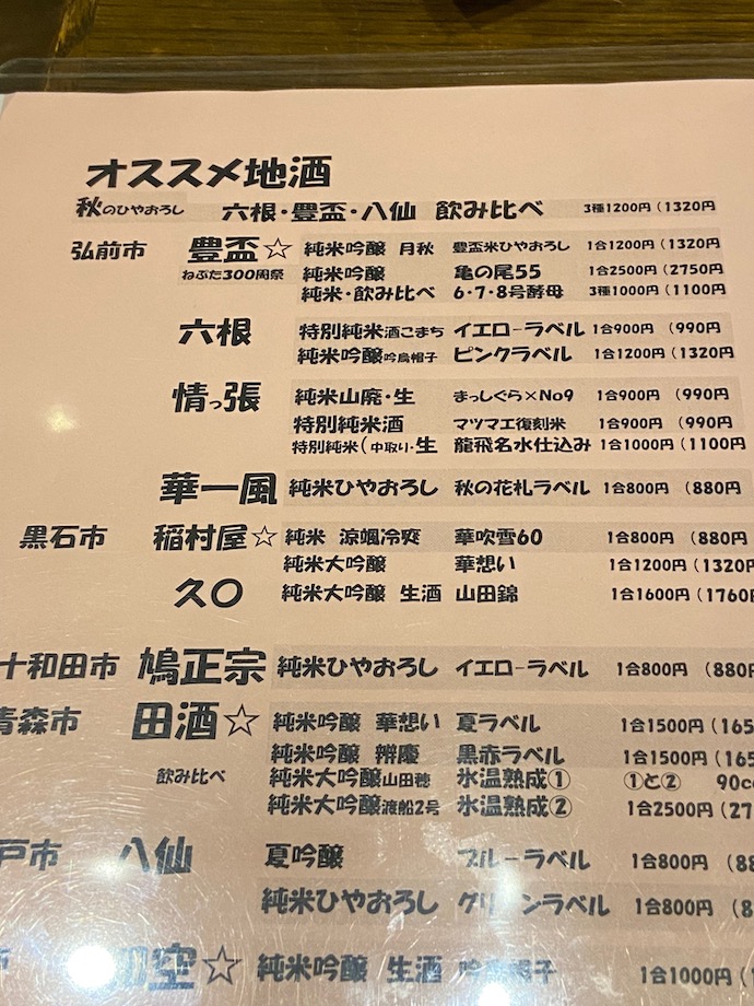 日本酒も青森推しだった。特に地元の豊盃をふんだんに置いてあるのが素晴らしい。蔵元がある弘前でも豊盃は手に入れるのがなかなか難しい名酒だ。個人的には、青森の豊盃、岩手のあさ開き、福井の黒龍が絶賛したい日本酒だが、どの酒も地元に行ってすら手に入りにくい。